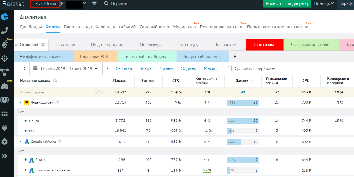На период сентябрь-октябрь была поставлена задача обеспечить поток заказов в меньшем количестве, но поднять стоимость среднего заказа, что и было выполнено путем изменения настроек кампаний.